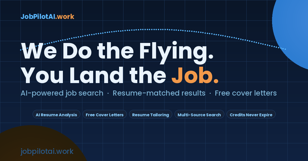 JobPilotAI.work makes absolutely no guarantee of employment, interviews, job offers, callbacks, or any employment-related outcome. AI match scores and job recommendations are informational estimates only and do not reflect actual employer hiring decisions, criteria, or intentions. We do not guarantee the accuracy, completeness, currency, or availability of any job listing. Job listings may be expired, filled, inaccurate, or fraudulent. You use all results at your own risk.